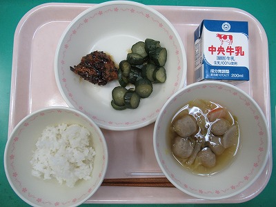 今日の献立:ごはん・牛乳・手作り飛竜頭・きゅうりの香り漬け・いわしのつみれ汁