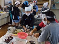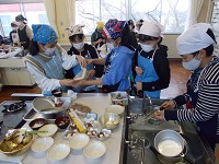 甘い香りがに誘われて家庭科室を訪れると、グループで仲良く協力して楽しそうに調理実習をする子どもたちの姿が見られました。