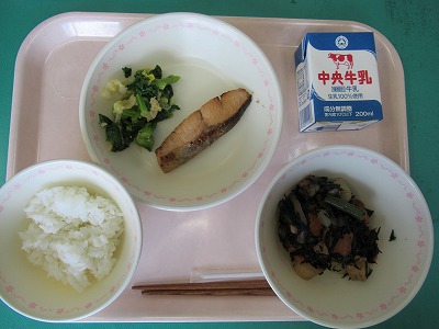 本日の献立:ごはん・牛乳・ひじきの旨煮・鮭の香味焼き・菜の花のごま和え