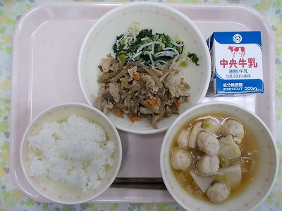 豚ごぼう丼 牛乳 小松菜の柚香和え