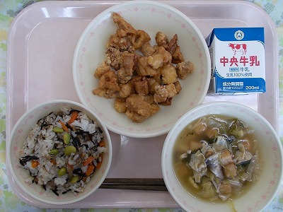 ひじきのまぜごはん 牛乳 鶏肉とれんこんのリンゴソース