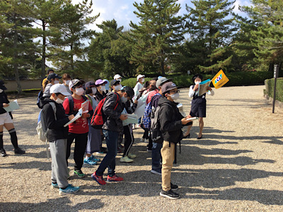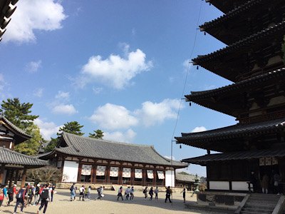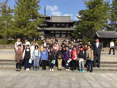 法隆寺の見学です。参拝者も少なく、しっかりとガイドさんの説明を聞きながら子どもたちは見学をしています。実物を前に興味津々の子どもたちの姿が見られました。