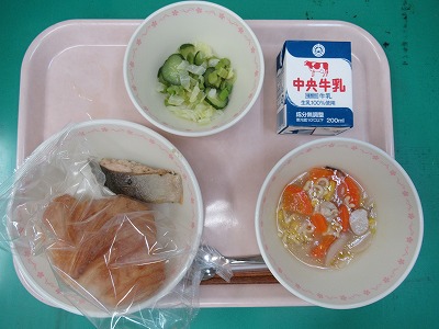 本日の献立:クロワッサン・牛乳・マスのハーブ焼き・グリーンサラダ・アルファベットスープ