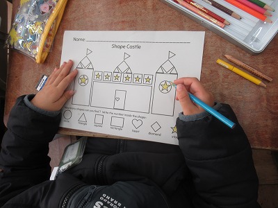 今日は、形(丸、四角、三角、ダイヤモンド、ハート)の言葉を知り、英語での表現を学びました。歌やチャンツで言葉に親しみ、絵の中の隠れた図形を探し見つけて、色を塗りしました。