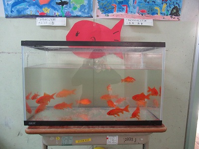 色鮮やかで大きな金魚を、たくさん頂戴しました。1年生と2年生の廊下の水槽と運動場北東の観察池に入れました。皆さん、ぜひ観てくださいね。とても優美です。
