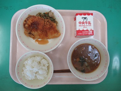 本日の献立:ごはん・牛乳・手作りとんかつ・きんぴらごぼう・春野菜のみそ汁