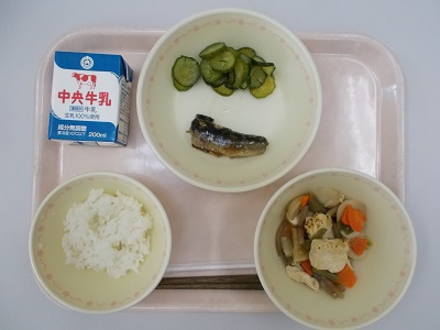 ごはん、イワシのうめに、いもに、キュウリの塩こうじ漬け、牛乳