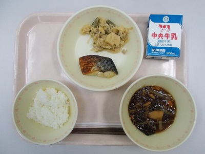 ごはん、サバのカレー焼、切り干し大根の炒め煮、あおさ汁、牛乳