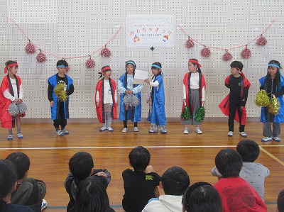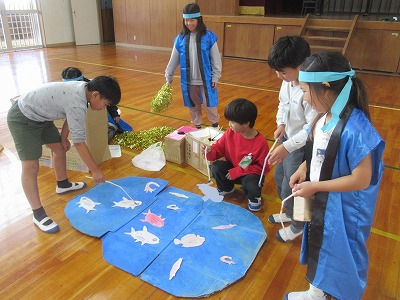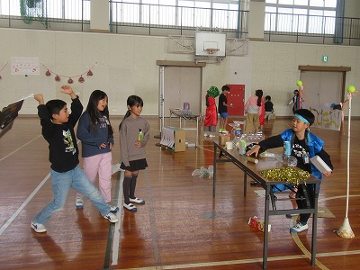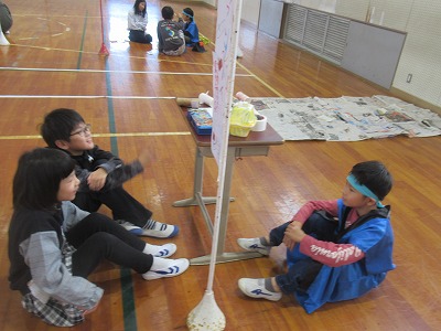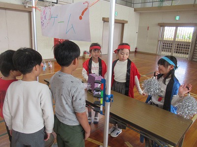 生活科の学習で、「おもちゃ祭り」を行います。これまでおもちゃの計画や準備をしてきて、本番直前です。今日は、先輩である3年生からアドバイスをもらうためのリハーサルを行いました。