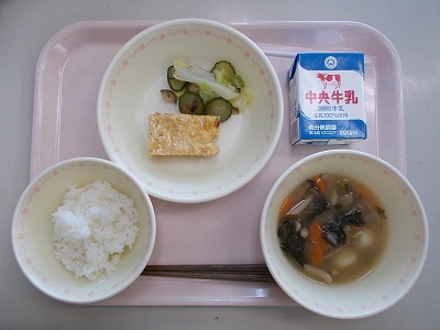 今日の給食は、佐織西中学校の生徒が考えてくれた「愛☆爆発給食」です。愛西市でとれる野菜(白菜、大根、ナス、レンコン、ニンジン、ネギ、三つ葉)がふんだんに使われていました。立田でいただくレンコンは普段と比べ、格別な味がしました。おいしくいただきました。