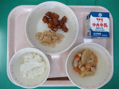 本日の献立:ごはん・牛乳・まぐろと大豆のマリアナソース・春大根のうま煮・新筍のピリ辛炒め