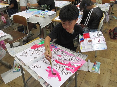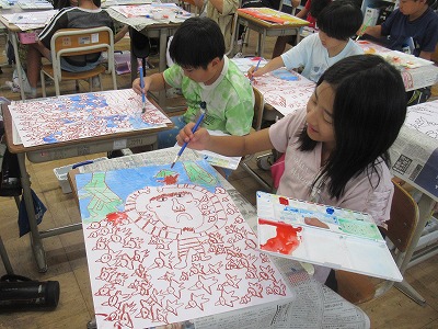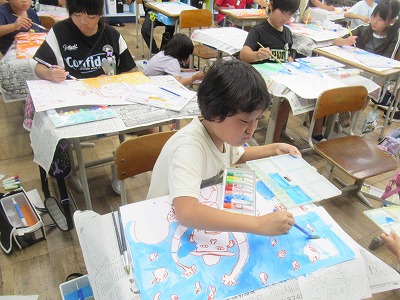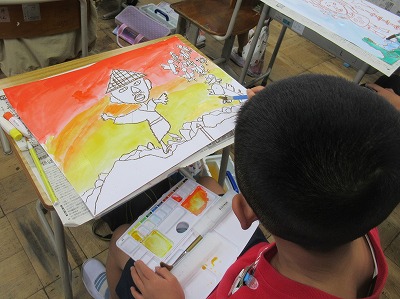 3年生も読書感想画に取り組んでいます。「かもとりごんべえ」というお話で、登場人物のごんべえさんと、かもを描いています。かもの多さや、背景の木々をたくさん描くのを頑張っています。