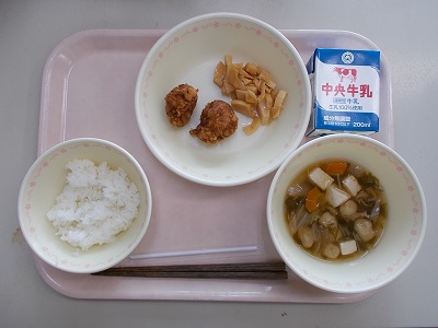 ごはん、鶏のから揚げ、新たけのこのピリ辛漬け、あおさのりの澄まし汁、牛乳