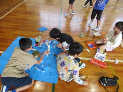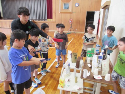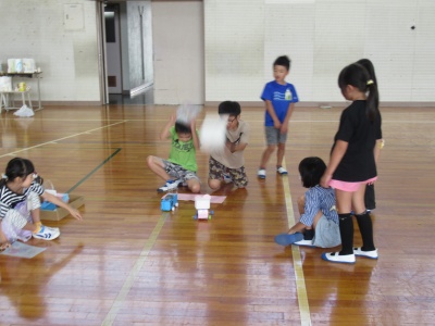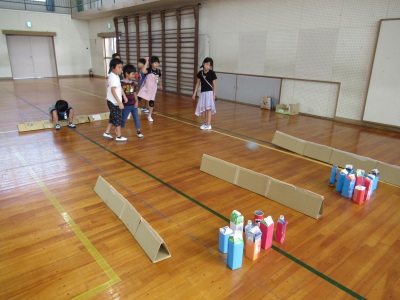 日常にある材料を使って、みんなが楽しめるお店をつくり、1年生を招待しようと頑張ってくれています。今日は、体育館にて、どのように設置するか、ちゃんと楽しめるか、試しをしていました。的当てゲーム、ボウリングなど・・・、とても楽しそうです!ぜひ、おうちでも話題にしてみてください。