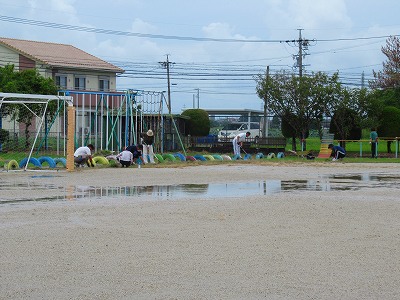 本日は保護者の皆様と職員でボランティア除草を計画していましたが、激しい雨が降ったり止んだりと不安定な天候かつ運動場にぬかるみができてしまったりしたため、除草作業は延期としました。ただし、学校にいた職員と来校いただいたPTAの方々と短時間の除草作業を行いました。9月1日、子どもたちが登校した際、少しでも活動しやすい運動場を目指して行いました。