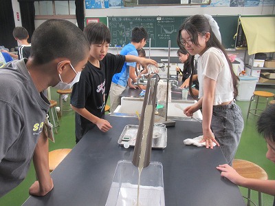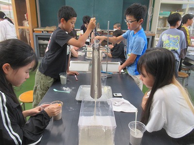 貝は海にありますね。それが堆積するには、山の土が雨によって浸食し、川の流れで運搬され、海に堆積していきます。山川海をモデリングした装置を用いて堆積実験をしました。今回も、たくさん堆積させようと、班で協力している姿が見られました。途中、『火山が爆発した!!』という想定で、カラーサンドを火山灰に見立てて堆積をしました。