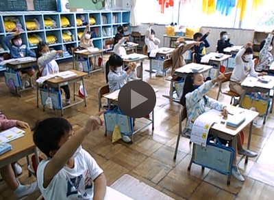 先生の合図で空中に文字を書いています。どんな文字を勉強しているか動画の前半部分から当ててみてください。