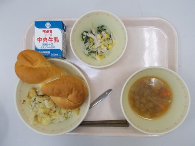 あいちのツイストパン、ジャガイモのチーズ焼き、みずなのイタリアンサラダ、オニオンスープ、牛乳