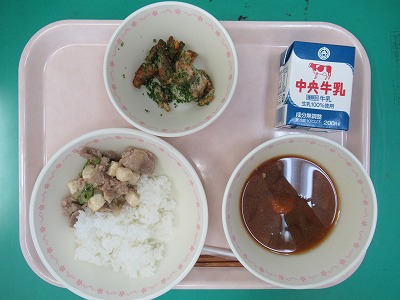 本日の献立:肉豆腐丼・海苔塩ポテト・根菜たっぷり味噌汁