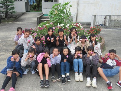 きれいに咲いてきたので、5年生で記念写真を撮りました。