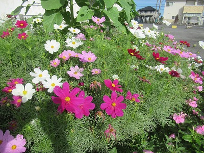運動会前に咲き始めた円花壇のコスモスが満開に近づいてきました。