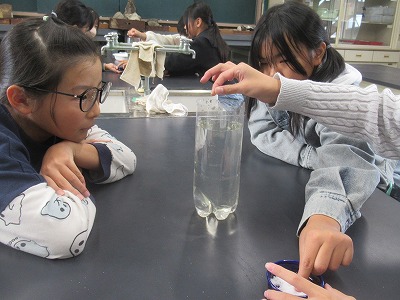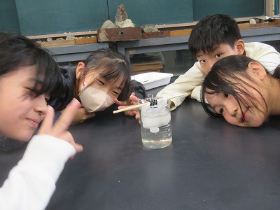 食塩の入ったパックからの様子を、「もやもや~って感じ!」「糸を垂らしているよう!」などと表現してくれ、しっかりと観察をしてくれました。その『シュリーレン現象』に興味をもってくれたので、長い筒に食塩数粒を上から入れると、溶けながら下に落ちる様子も観察しました。
