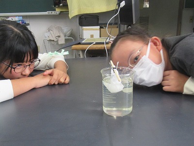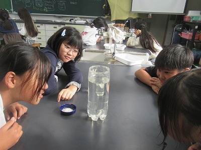 今日は導入として、生活の中で、紅茶に砂糖を溶かしたり、湯舟に入浴剤を溶かしたりした経験を想起してもらい、水に食塩が溶けていく様子をじっくりと観察しました。