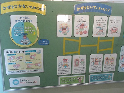 県下ではインフルエンザを注意するように伝えられています。本校では罹患している人はゼロ(いません)が、日頃から手洗い・うがい・規則正しい生活など、予防をこころがけてください。保健室の掲示板にも『かぜをひかないために』の内容があり、啓発をしています。