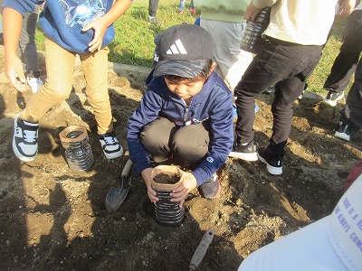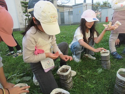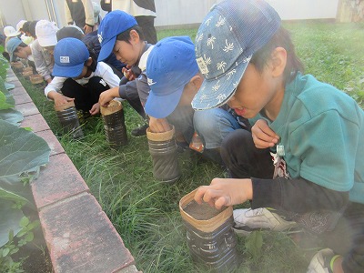 学校ボランティアさんに来ていただき、冬野菜『だいこん』を育ててみることにしました。1人1鉢(ペットボトルを利用)に、土を入れ、だいこんの種を3つ蒔きました。