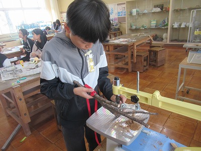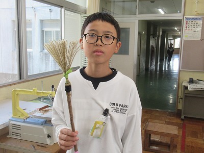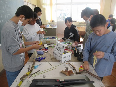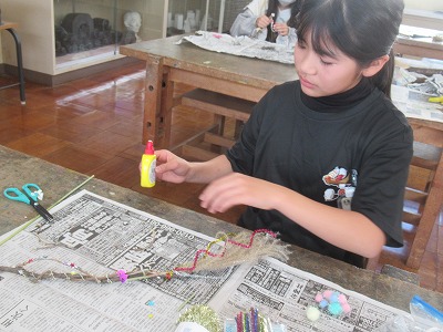 校庭に落ちている枝に、つるなどを巻き、ススキの穂をつけるなど、自然を感じながら創作活動に取り組んでいます。モールやリボンなどを巻いて、デコレーションも楽しんでいます。筆というより、ほうきや魔法の杖のようにも見えますね。