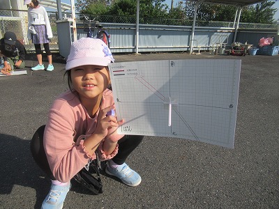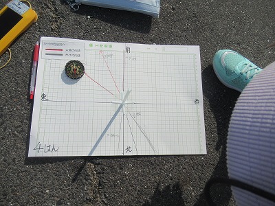 時間おいて何度か、かげを記録しました。また、太陽の向きを遮光板を用いて観察し記録しました。