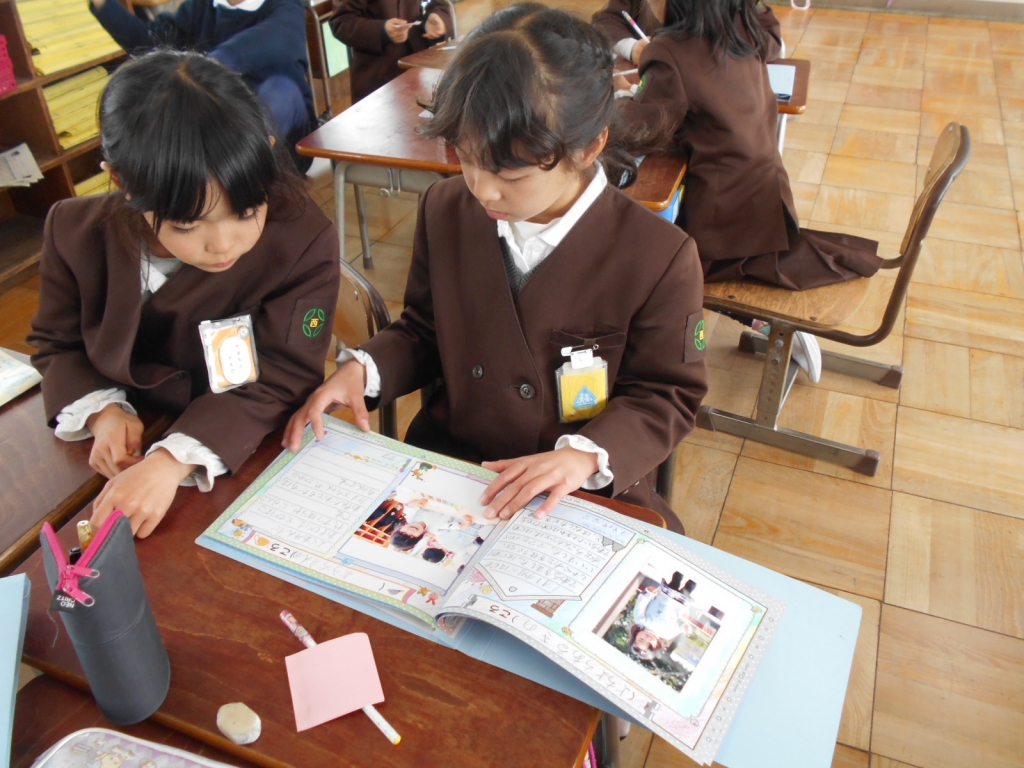 どの学年も学年のまとめや作品の整理をしています。2年生は、友達の成長のアルバムを見あいながら感想を書いていました。3年生は、作品の額を作っていました。
