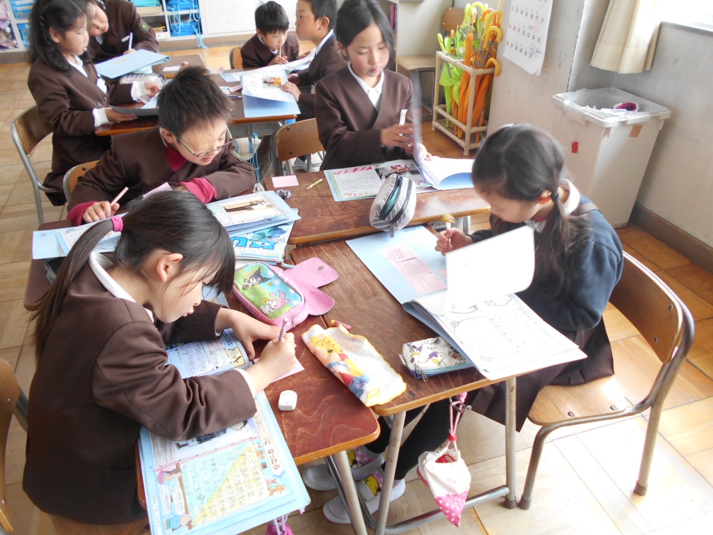 春が近づいてきて、ぽかぽか陽気になりました。1年生が育てているチューリップやすいせんも咲いています。3年生は、元気にサッカーをしました。4年生は、作品をまとめ、4年生の作品集を作りました。
