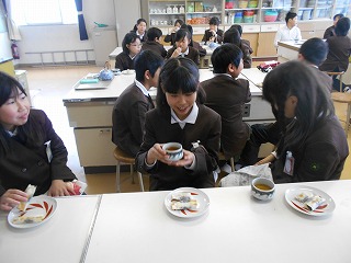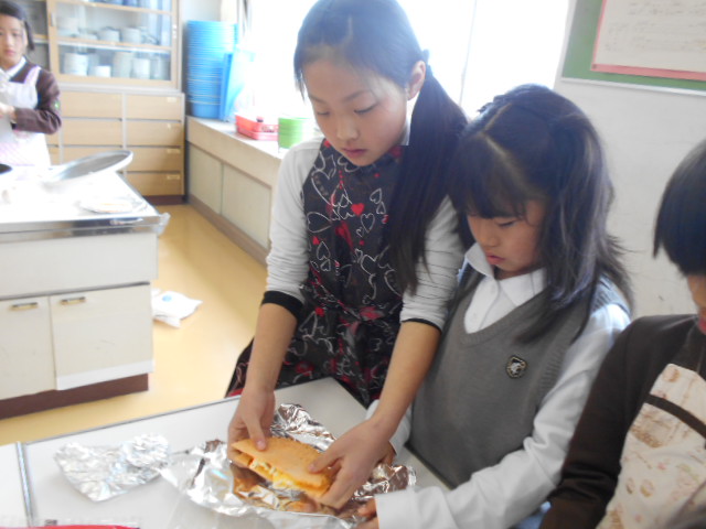 5年生は、家庭科の学習で作ったマイ・エプロンを着て、おやつ作りをしました。今日作ったのは、和のスウィーツ「あんこ入りお餅春巻き」。黒のすり胡麻が香ばしく、あんこが苦手な子も、ほうじ茶と一緒においしくいただきました。