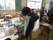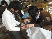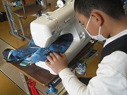が完成してきました。ほとんどの子がミシン縫いを終え、首にかけるためのひもを通しています。ひも通しの部分を、筒状にうまく縫えているか肝心ですし、たとえできていても、ひもを通すこと自体に慣れていないので、反対に引っ張ってしまい、途中でひもが抜けてしまう子もいたようです。