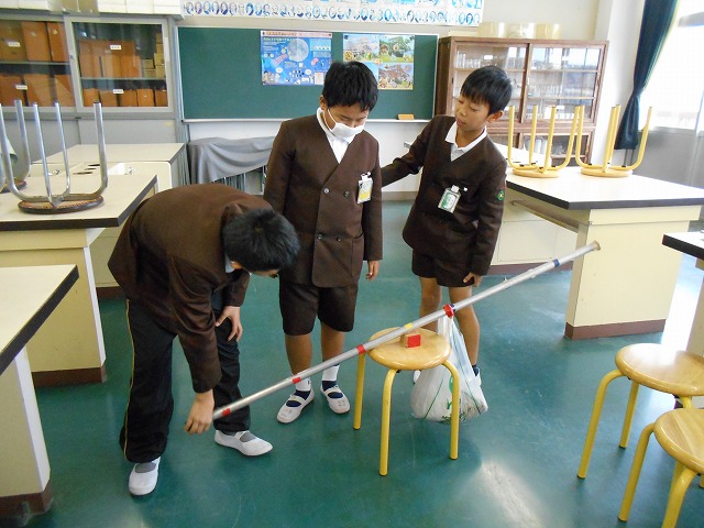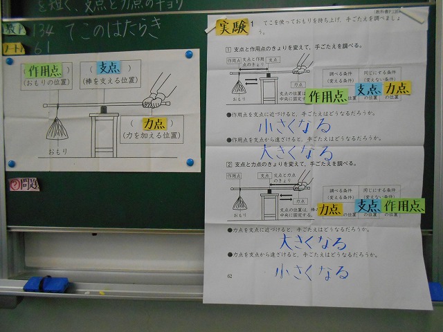 6年生は、てこの実験をしました。力点・作用点の位置をどのようにすると、小さい力で物を持ち上げることができるか実験しました。