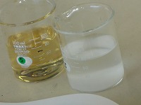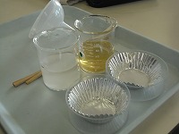 溶かしたら透明になって見えなくなってしまうものや、濁ってしまい時間がたつと下にたまるものなど種類によっていろいろです。下のビーカーで、白い方は片栗粉、茶色っぽい方はコーヒーシュガーを入れて混ぜたものです。