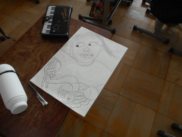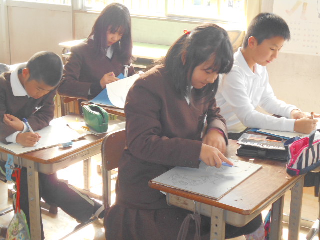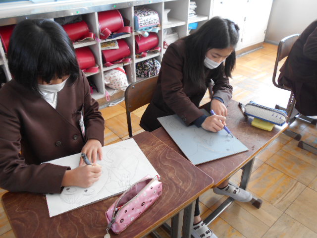 5年生は、版画制作が始まりました。お餅を食べる様子を丁寧に表現します。