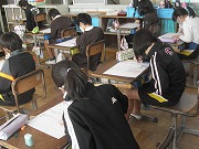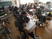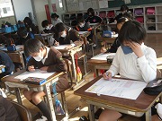 4年生は、国語の聞き取り問題に取り組んでいました。CDから流れてくる文章を聞きながら重要だと思う内容をメモして、後から問題に答えます。話のポイントをうまく聞き取ることができるかが決め手です。