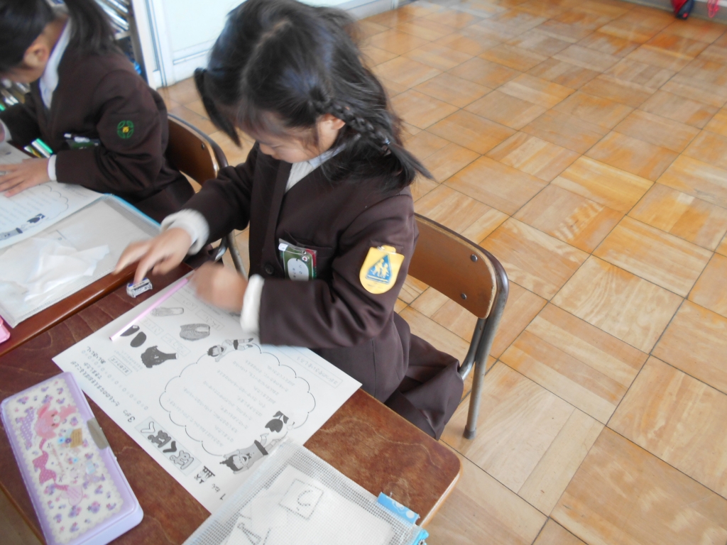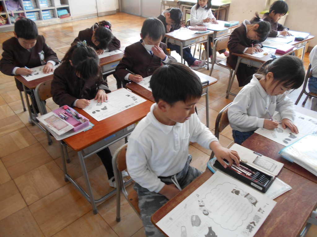 2月ももうすぐ終わりです。3月の献立表が配られました。1年生は、裏にある食べ物の名前クイズをしました。ひらがなもカタカナも上手に書けるようになりました。
