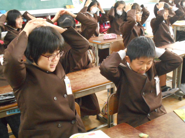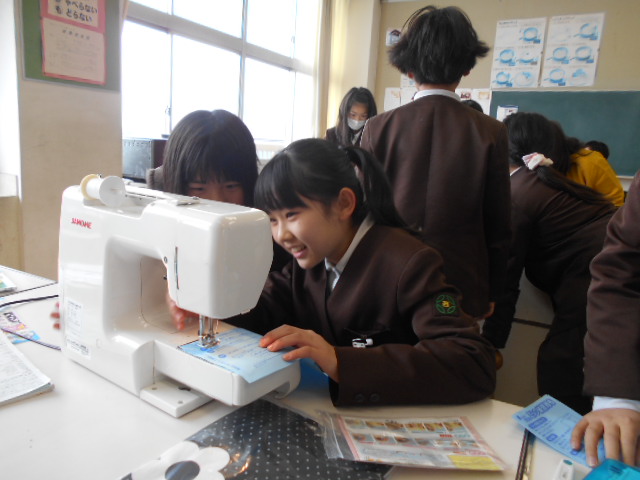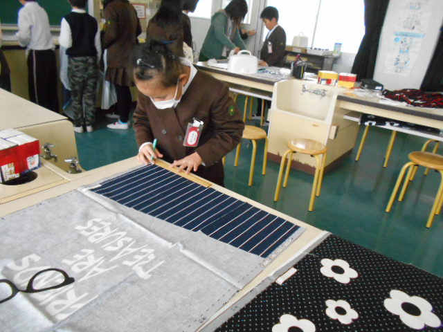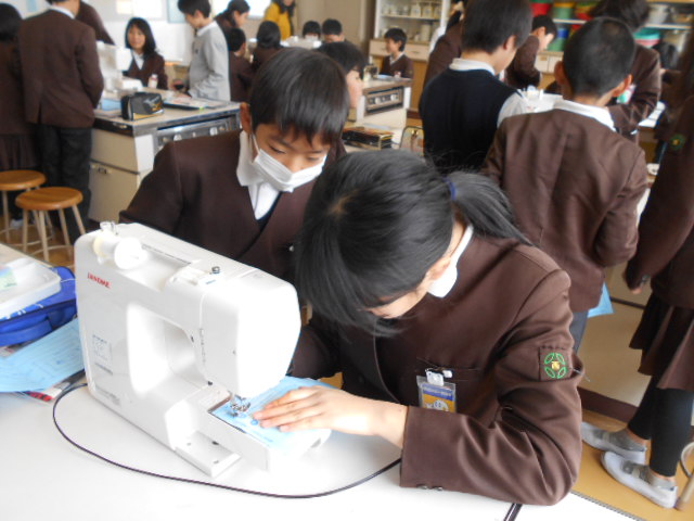 5年生は、英語の勉強をALTの先生としました。ジェスチャーを交え、とても楽しそうです。また、ミシン縫いの練習が始まりました。エプロンを作ります。今日は、布の裁断もしました。
