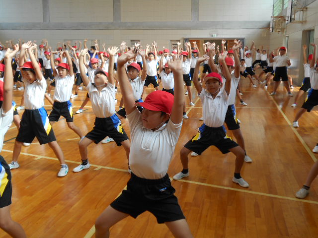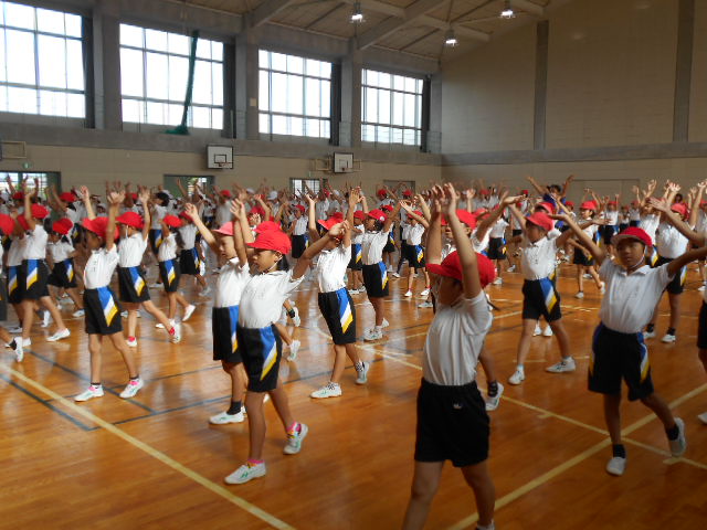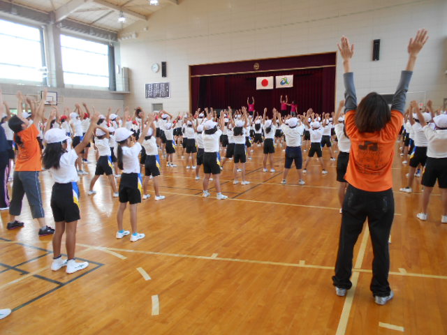 体育館で「愛西のびのびストレッチ」の練習をしました。愛西市健康推進課から、講師の先生に来ていただき、教えていただきました。運動会当日は、午後の部の初めに行います。