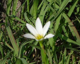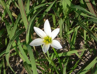 この花は、たぶん「タマスダレ」という花だと思われます。本来は夏から秋にかけて咲く花のようです。しかし、そのころ(夏から秋)には見かけなかったのに、どこからか落ちた種が最近の秋の暖かさに勘違いをしたのか、一輪だけ咲いていました。