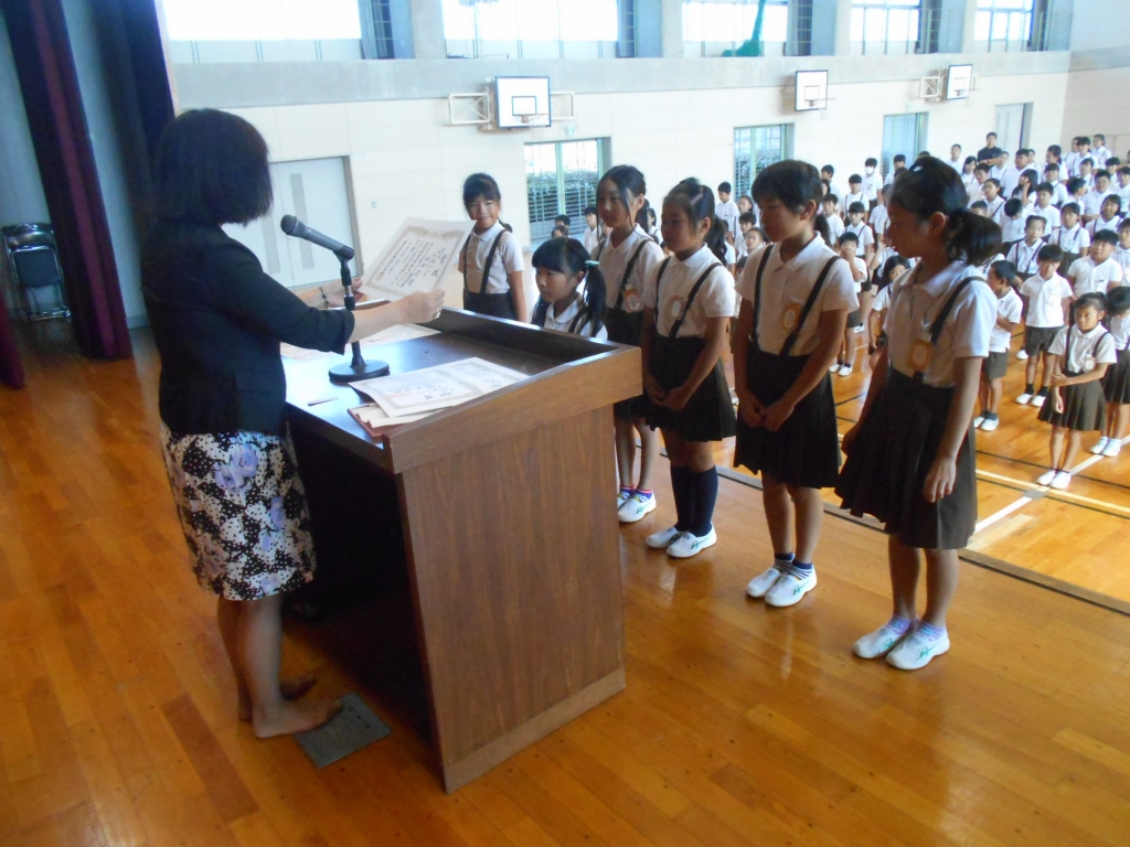 朝礼で、読書感想文コンクールと全国敬老キャンペーン“あいち”の表彰をしました。