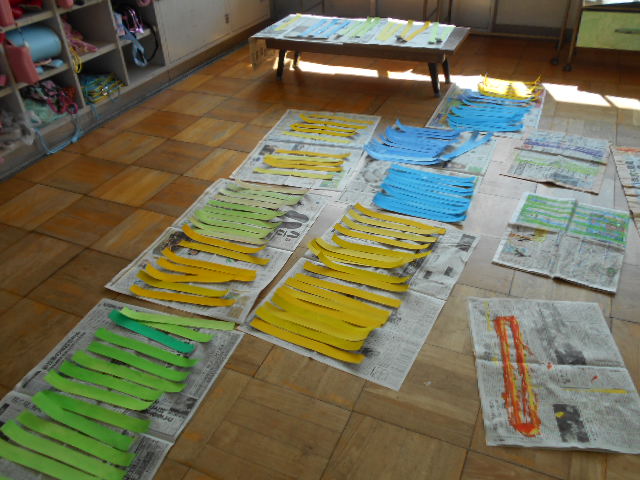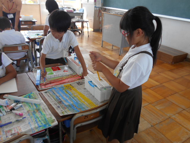 2年生は、作品展の作品づくりをしました。絵の具で色をつけた紙でお皿を作ります。