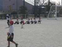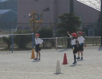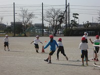 2年生が、体育館で練習していた「野球ゲーム」を運動場で取り組んでいました。