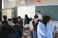 代表が前に立って英語で号令をかけますが、みんなは目を閉じて、号令の言葉を聞き取って行動します。みんなに分かりやすい号令をかけるか、みんなはきちんと聞き取って行動できるかそれぞれ勝負です。