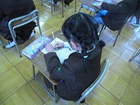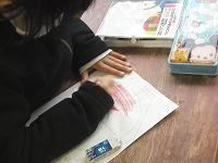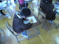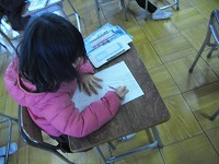 1年生が図工で、正月らしくたこを作ります。その、「ぐにゃぐにゃだこ」のデザインを一人ひとりがデザインしていました。描いてある絵によって、揚がるかどうかの差はあまりないと思いますが、子どもたちの気分は明らかに変わります。みんな真剣に考えていました。