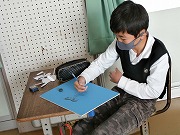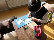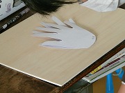 5年生が図工で版画に取り組み始めました。自分の顔と両手を画面に入れてした絵を描きます。手のかたちをどうするかイメージしやすくするために画用紙で手形を作って、指のかたちや手の配置を工夫します。