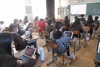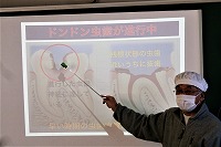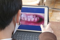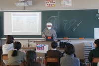 学校歯科医の先生に来てもらって、5年生と6年生を対象に「バトンタッチ運動」の授業を行いました。先日も紹介しましたが、海部歯科医師会と学校が協力して、「乳歯から健康な永久歯にバトンタッチ」できるようにさまざまな学習をしています。虫歯の仕組みや、歯のよい磨き方、歯ブラシだけでなく、デンタルフロス(糸ようじ)や歯間ブラシのちがいなども教えていただきました。以前夏休みに各家庭で取り組んだ自分の歯の染め出しの写真を見て、磨きにくいところを確認し、今後の歯の磨き方を向上させていきます。